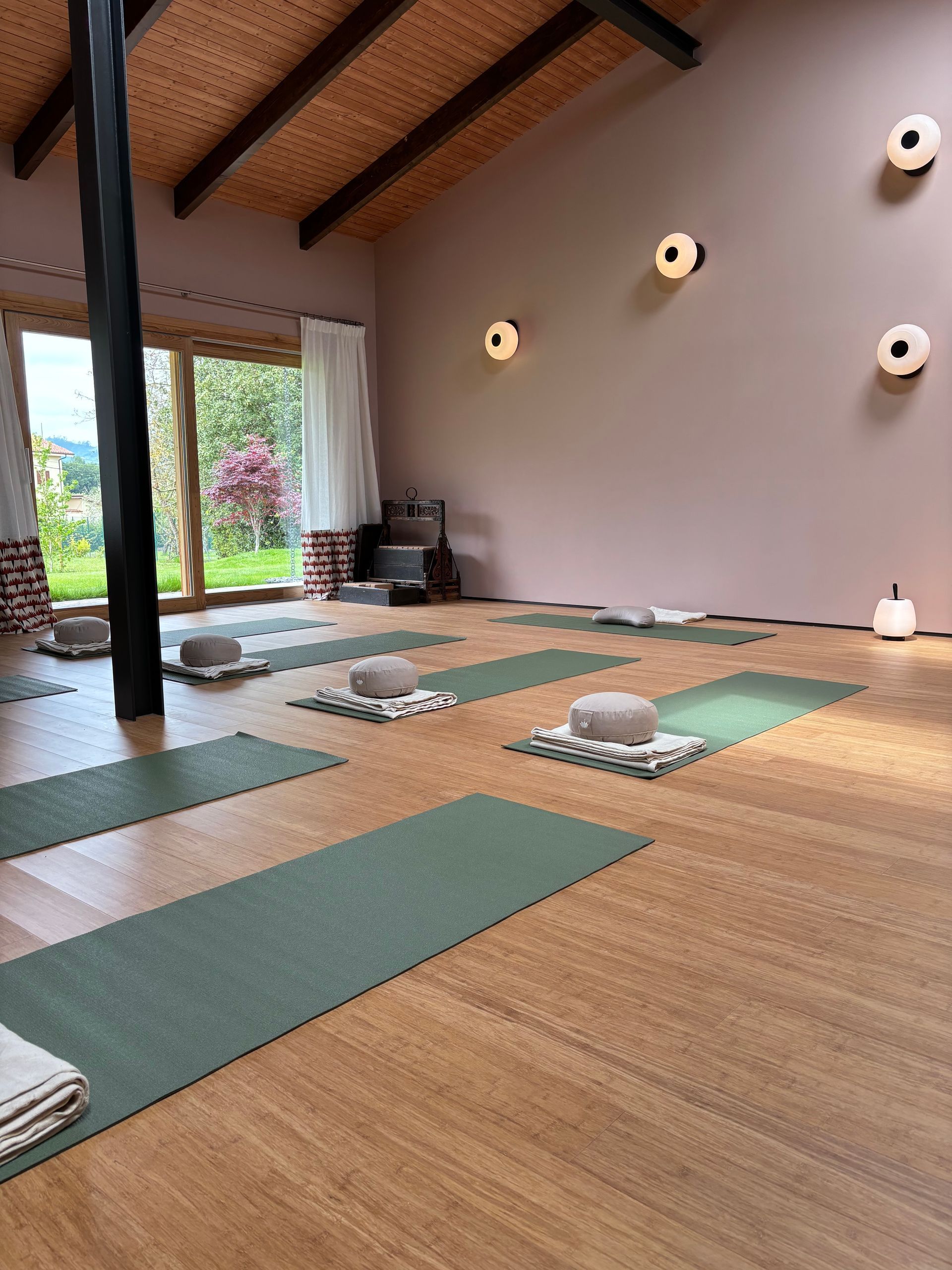 Der neu gebaute Yogapavillon befindet sich auf einem weitläufigen Anwesen in Gobiendes, Asturien. Er besteht aus einem großzügigen Haupthaus, dem Pavillon und einem weitläufigen Garten am Rande des Dorfes mit herrlichem Blick auf die Berge und das Meer. Der Yogapavillon besteht aus Kastanienholz, als Hommage an die traditionellen asturischen Bauten, die Hórreos. Der Bambusboden, die warmen Farben, das Holz der Decken und Fenster und die in Tibet ausgewählten Möbel laden zur Innenschau ein. Das moderne und gemütliche Haupthaus verfügt über eine geschützte Südterrasse, auf der wir das Frühstück und das Abendessen einnehmen. Von hier genießt man einen herrlichen Blick auf die Sierra del Sueve und das Dorf Gobiendes.
